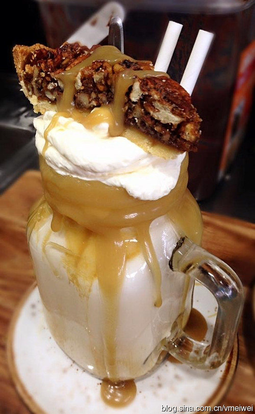 (6月6号,The Nutty Pât,盐味焦糖、掼奶油、核桃派全部摞在热奶昔上。100个赞。图片来自网络)