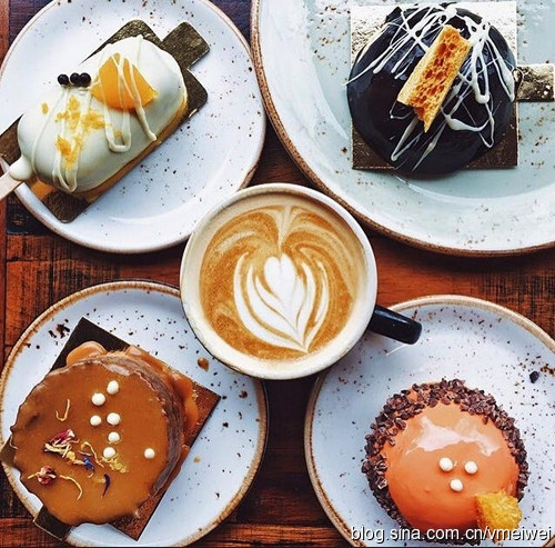 (各种配咖啡的甜点。画风粗犷奔放,中规中矩中有一种喷薄而出的欲望,好像可以看到一个个甩开腮帮子享受它们的Foodie。图片来自网络)
