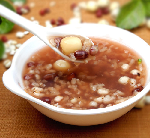如果着凉感冒了,或是体内有寒,胃中寒痛,食欲不佳,可在薏米赤小豆汤中加几片生姜。生姜性温,能温中祛寒,健脾和胃。注意,生姜不可多放,多放就使粥变得辛辣了。如果想在汤里加点调味品,最好放红糖,红糖是性温的。需要注意的是,妇女产后保养时,喝赤小豆薏米汤要去掉薏米,可在其中加点大枣,大枣对温中、健脾、养血是非常适宜的。