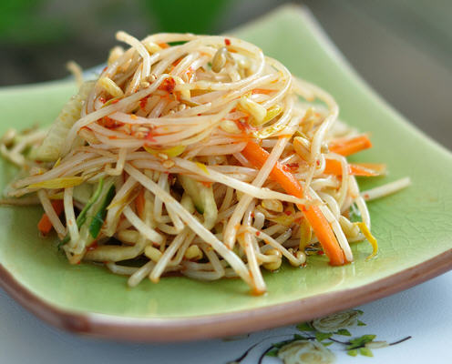 4、黄瓜洗净切丝盛到干净小盆里,放进炒好的胡萝卜丝,绿豆芽,倒入1/2汤匙凉拌酱油,再调入1汤匙凉拌醋。