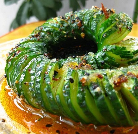 1.黄瓜洗净,密密斜切,但是不要切断,每一刀切到黄瓜的四分之三处就可以了。然后转过没有切透的那一边,换一个角度重新切一遍