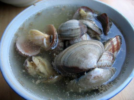 说明:一般情况下,大多数人都是只放盐或者只放油,其实两者同时放效果最佳,所需要的时间也最短,可以让蛤蜊更好的吐净泥沙。