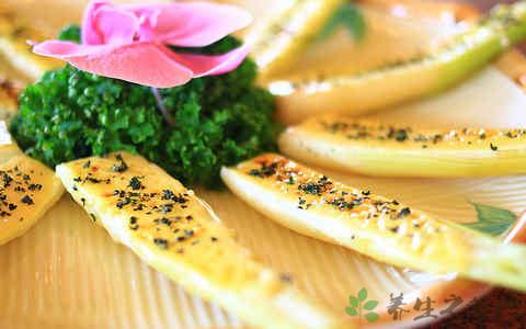 茭白从唐朝开始就被人们广泛种植,而茭白的种子是我们的五谷之一,后来人们发现,有些菰因感染上黑粉菌而不抽穗,且植株毫无病象,茎部不断膨大,逐渐形成纺锤形的肉质茎,外披绿色叶鞘,内呈三节圆柱状,色黄白或青黄,肉质肥嫩,纤维少,蛋白质含量高。茭白是我国的特产蔬菜,是“江南三大名菜”之一。