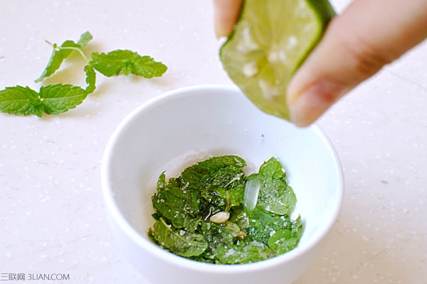 3.将对半切开的青柠汁挤在薄荷叶中;