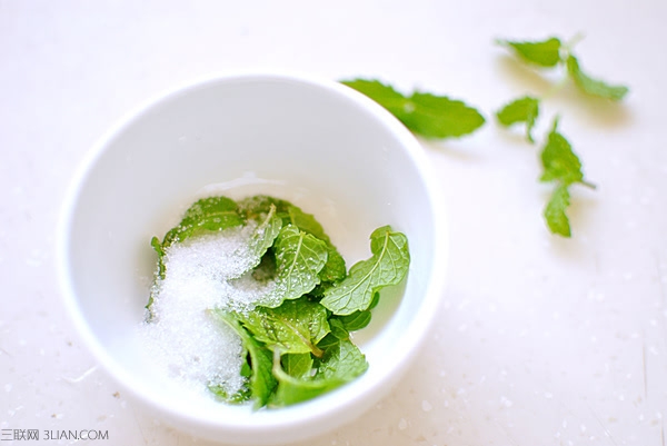 2.薄荷叶洗净后放入清水中浸泡一会儿,取下嫩尖,余下的部分加入白砂糖,用勺子的背面研磨至薄荷叶颜色变深出汁;