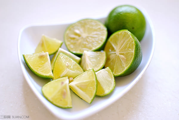 1.青柠洗净,一个切成八瓣柠角,另外两个对半切开;