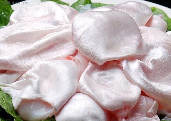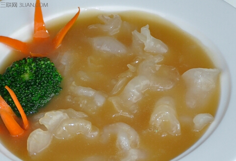 鱼胶 15-20 克,猪肚适量。将猪肚和鱼胶一起放入炖锅中炖 3 个小时,调料即可食 用。