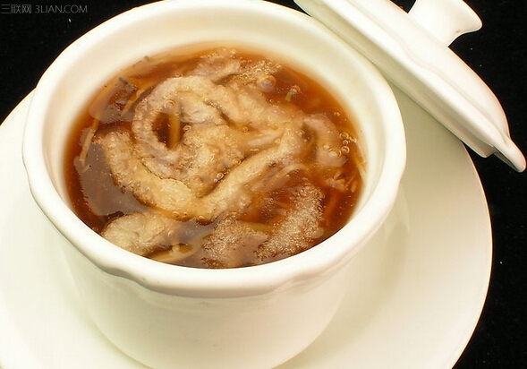 鱼胶 15 克红枣(去核) 4-5 个,加水适量,炖大概 2-3 个小时,放入冰糖即可食用。本汤适用于补气血、养容颜,对于气血不足,失于调养,症见神 疲体倦,肌肤不泽,面部皱纹者尤佳。(当然您可以加入莲子、百合、枸杞、洋参、桂圆肉等下 去一起炖的)。