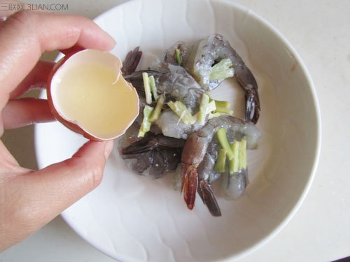 在处理好的虾中加入姜丝、盐、生粉、料酒和半个蛋清,抓匀后,静置10分钟。