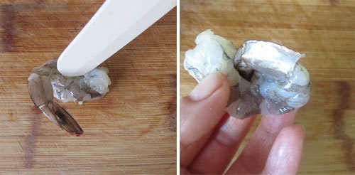 大虾去头去皮,虾背上划开,挑出虾线,洗净后用干净的布吸干水份。