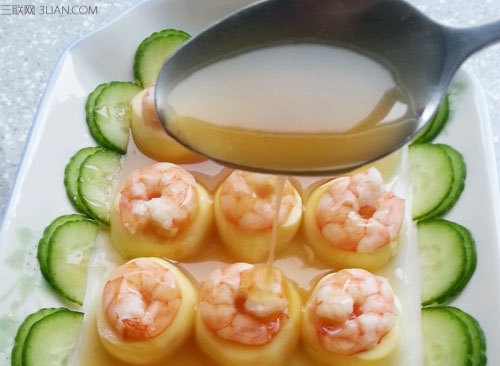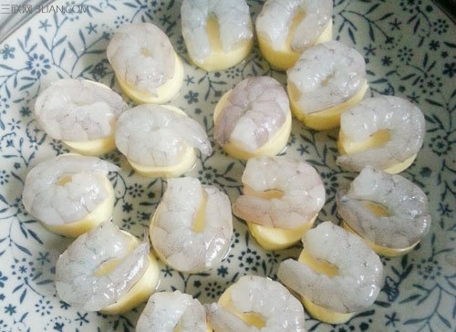 准备食材 第一步 处理粉丝 大虾去头去壳去虾线,洗净备用。 第二步 摆盘 把日本豆腐切成一厘米厚度的片状,摆入盘中,豆腐表面各摆放一只处理好的虾仁,装点青豆,撒少许盐。 第三步 蒸 上锅蒸,锅开后三五分钟即可,保持豆腐与虾鲜嫩的口感。 第四步 勾芡 把蒸出来的水份倒入碗中,加少许生粉调匀,倒入锅中,淋少许生抽,小火煮成薄薄的芡汁,把芡汁浇在蒸好的玉子虾仁上即可。 注:更多精彩文章请关注美食菜谱栏目。食材虾仁、日本豆腐、青豆配料盐、生抽、香油、生粉