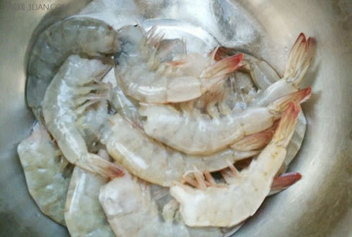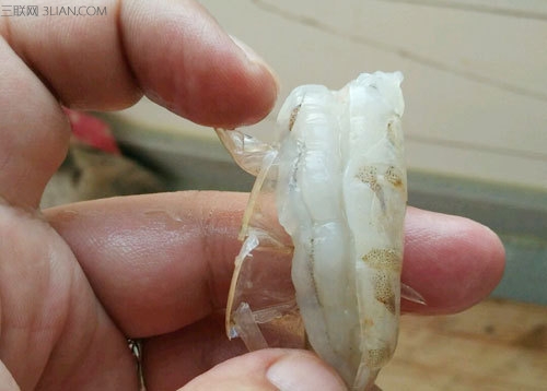 虾剔除虾线,洗净,开背,开至虾背三分之二处;开背后,使虾壳与虾肉分离,鲜虾肉不会掉出来为准。
