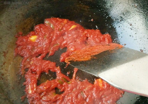 八角、姜、葱、大蒜,按顺序把香料倒入锅内煸香,倒一些番茄酱,小火炒出红油。