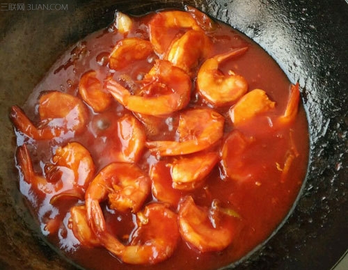倒入炸好的大虾,再加入白酒、白醋、糖、生抽、蚝油和水,翻匀;加盖大火焖煮一分钟,开盖收干汤汁即可。