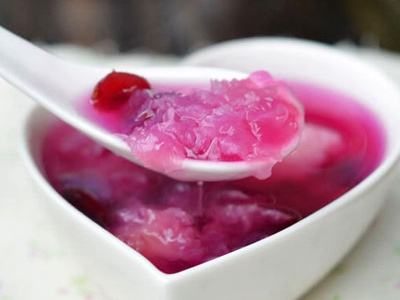 5、1小时后,银耳已经煮得比较软了,下入紫薯和冰糖,继续煮45分钟。至紫薯熟透,汤汁粘稠即可。冰糖的用量根据个人口味增减,如果是晚上喝,就不要放太多。