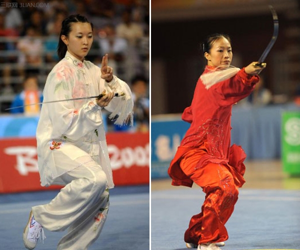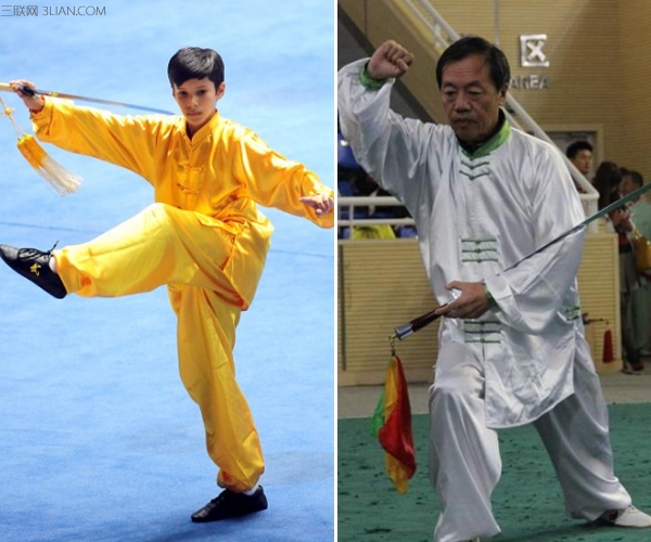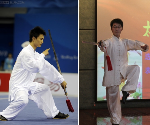 要点:两臂上举时,不要用力,两手宽度不超过两肩。剑身在左臂下要平,剑尖不可下垂。