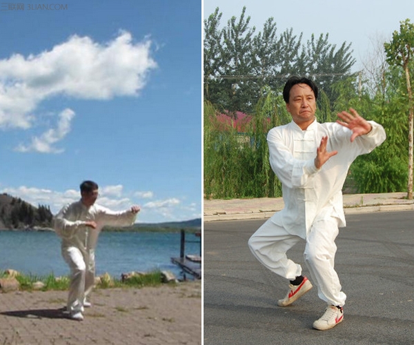 也是定步练习。弓步型两脚要踩在“川”字两端,既能兼顾前后,又能兼顾左右,重心稳定,转胯灵活。