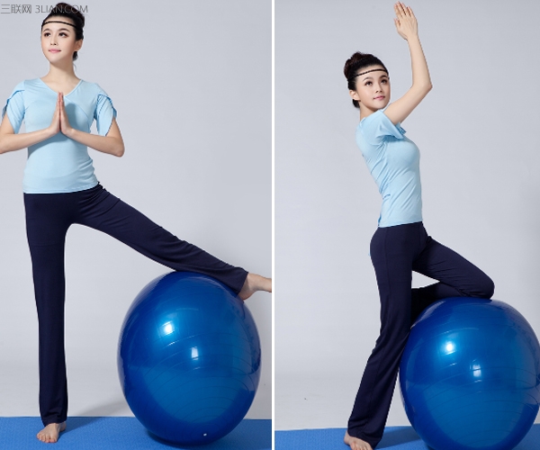 双腿并拢,双手向上举,十指相对,深呼吸,收腹挺胸,整个身体尽力向上提拉。瘦腰腹,挺拔身姿。站姿双腿尽量分开,抬起左手臂,身体慢慢向右侧伸展,右手扶住球,直到左手臂与地面保持平行,深呼吸,保持姿势几秒钟。该动作能提升整个腰背部的力量。