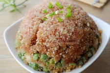 主料:猪腿肉400g,豌豆220g,蒸肉粉120g。辅料:生抽100g,香葱适量,花生仁40g。
