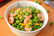 主料:豌豆(鲜)250克,北极虾250克,甜玉米100克。辅料:淀粉3克。调料:花生油15毫升,食盐3克。