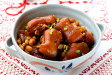 主料:猪蹄2个,黄豆50克。调料:食盐5克,酱油2大勺,冰糖1小把,姜5片,八角1个,花椒15粒,干辣椒5个,料酒2大勺,小葱1根,植物油3大勺,黄酱2大勺,水适量。