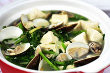 主料:卤水豆腐1块,文蛤16个,茼蒿1把。调料:食盐1/2茶匙,葱1段,姜1块,水,食油。