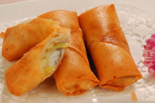 4、将春卷皮摊开,放上适量馅料和鱼肉,从一边卷向另一边,卷一半后再将两边向中间折起,继续卷完,用水淀粉封口即可下锅炸,油烧至7成热,炸至表面呈金黄色,捞起控油后即可。