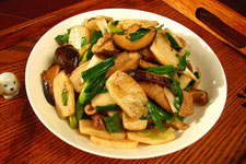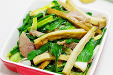 主料:青蒜400g,熏干150g。辅料:玉米油,盐,生抽,姜丝,猪肉,味精。