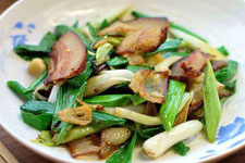 主料:腊肉300克,青蒜2棵。调料:食盐1/4茶匙,味精1/4茶匙,蒜2瓣,姜粉,植物油。