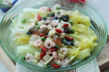 主料:娃娃菜200g,红虾。调料:食盐2g,高汤100ml。