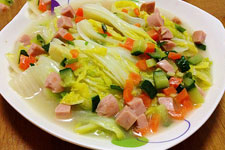 3、锅内加入适量清水,下入火腿煮和瘦肉,水煮开后放入娃娃菜炖煮至熟,使用的咸肉所以无需放盐。