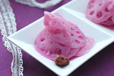 1、莲藕去皮洗净后切片,尽量切薄些,这样比较好上色,紫甘蓝放入冰水。