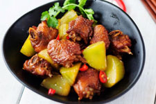 4、另起油锅放入生姜丝辣椒碎爆香,倒入鸡翅块和切好的莴苣块,调入精盐、味极鲜酱油,和适量腌渍鸡翅块的料汁,翻炒均匀后小火焖烧15分钟即可出锅。