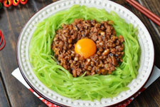 3、另起锅热油,放入香菇丁和肉末炒散后加盐、酱油,翻炒均匀后勾芡,将炒好的杂酱摆盘,即莴笋丝的中央,再磕一个生鸡蛋在上面,吃的时候拌匀即可。