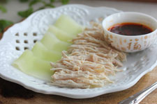 5、将兑好的调味料放在摆好莴笋片和鸡肉丝的摆盘中,蘸来吃,也可以把调味料直接淋到鸡丝上。