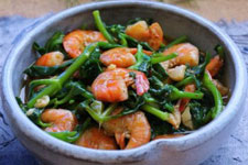 主料:海虾100g,穿心莲400g。调料:食盐酱油10ml,鸡精3g,蒜,调和油,花椒粉3g。