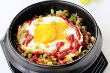 5、把石锅内壁刷上油,加入米饭,铺上雪里蕻好肉末 ,放上荷包蛋,加入适量的拌饭酱,沿着石锅边浇上植物油。