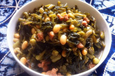 主料:雪里蕻200g,黄豆50g,猪肉(瘦)100g,青豆30g。辅料:油30g,淀粉1勺,葱3g,料酒2勺,酱油2勺,姜2片。