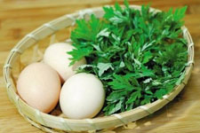 主料:鸡蛋2个,乌鸡蛋1个。辅料:艾叶20克。调料:大蒜1个,土鸡蛋1个,艾叶。