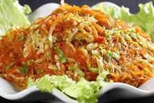 5、放入八成熟的粉丝炒匀,放入适量的香油,调入盐,味精,翻炒均匀,即可出锅。