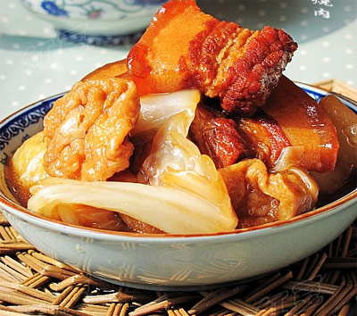 先将整块连皮猪肉刮干净毛,清洗干净,放入大锅中煮熟,再切成1.5厘米之四方块。然后将适量(以用肉量而定)红糖或白糖、特级酱油熬成卤汁(熬至卤汁呈金黄略赤时即可)。