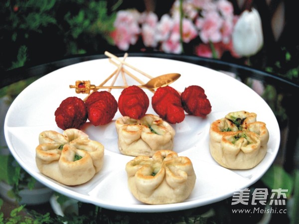 美好的一天从自制的花朵开始,味蕾被唤醒,被清香的味道围绕着,美味的无法抵挡哦。 主料 肉馅(荠菜)200克 面粉250克 辅料 酵母3克 油适量 花朵馒头的做法 1.面粉加入酵母温水搅拌成雪花状 2.揉成面团揉光发30分钟 3.再次揉光搓条下剂子 4.然后擀成圆形 5.包入荠菜肉馅 6.捏出五个角 7.成一朵梅花,再一次发酵15分种 8.把发好的花朵馒头放在平底锅内加少量的油和水盖上盖煎一下 9.水干了翻身再煎一下至两面金黄了就可以出锅了 10.装盘趁热吃哦 烹饪技巧 也可以蒸好后直接吃。