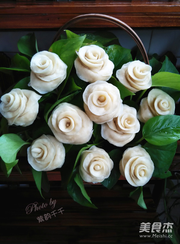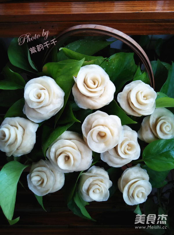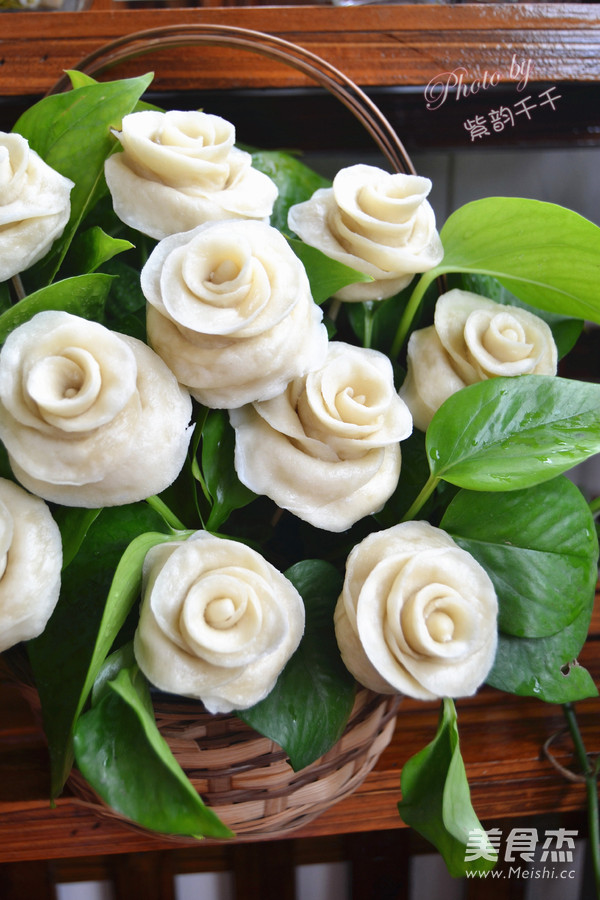 面片我擀得比较薄,这样玫瑰花瓣出来效果比较薄,蒸好后焖几分钟再打开锅盖,可防止馒头回缩。