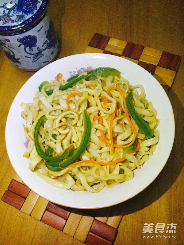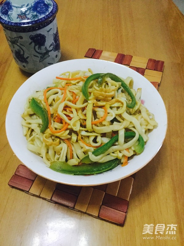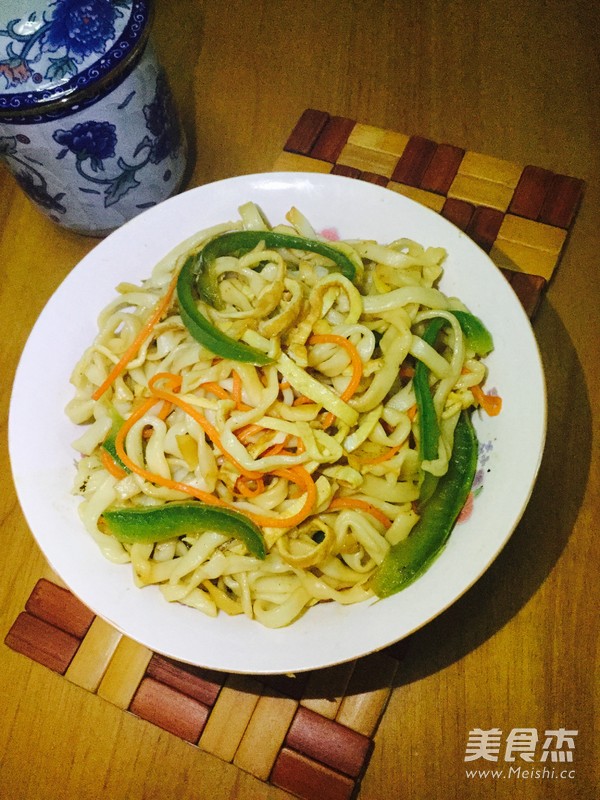 就喜欢吃自己做的面条 主料 面条500克 胡萝卜50克 青椒25克 鸡蛋100克 辅料 油20克 盐10克 生抽5克 三丝炒面条的做法 1.准备好材料 2.胡萝卜和圆椒都切丝 3.烧开水,加入油盐 4.水开后,放入面条煮熟透 5.捞起,过冷河,沥干水分 6.鸡蛋磕到碗里,加入盐和生抽,搅成蛋液 7.起油锅 8.倒入蛋液,摊薄,煎至熟 9.鸡蛋切丝 10.放入圆椒 11.放入胡萝卜同炒至熟 12.起油锅 13.放入面条炒2分钟 14.加入圆椒和胡萝卜丝 15.加入蛋丝,加入生抽,捞匀 16.盛出 烹饪技巧 煮面的时候在开水中加入油盐,面条就不会粘连