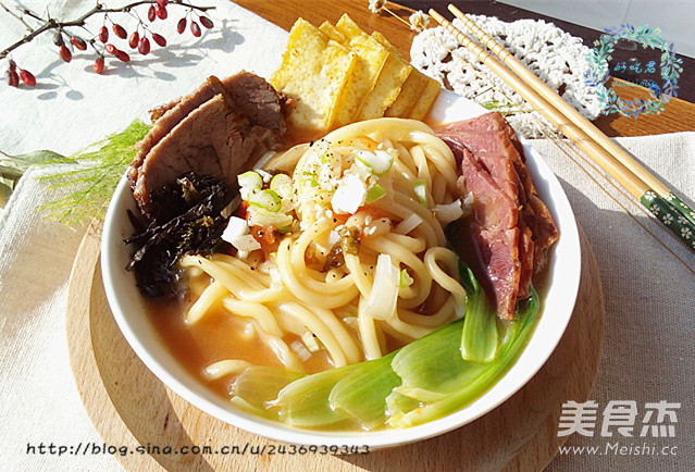 面条(生)200克 豆腐50克 油菜(小)2棵 白菜50克 紫菜10克 卤牛肉20克 牛腱子15克 洋葱20克 西红柿1个 山药10克