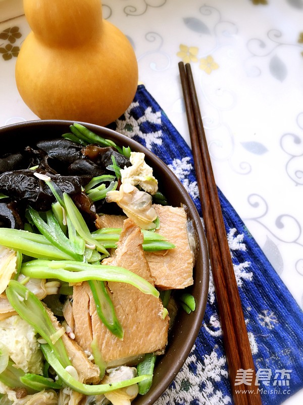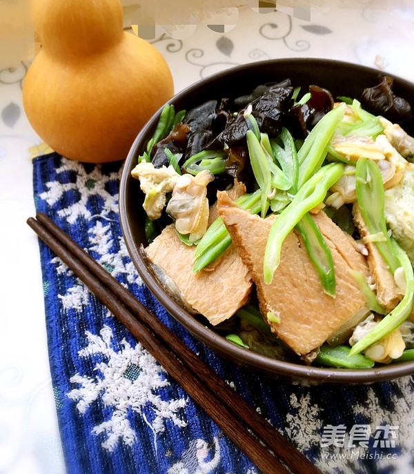 8.汤沸腾后,倒入搅拌好的鸡蛋液,放入木耳,肉片。加盐、味精调味,最后在起锅前加入蚬子肉。