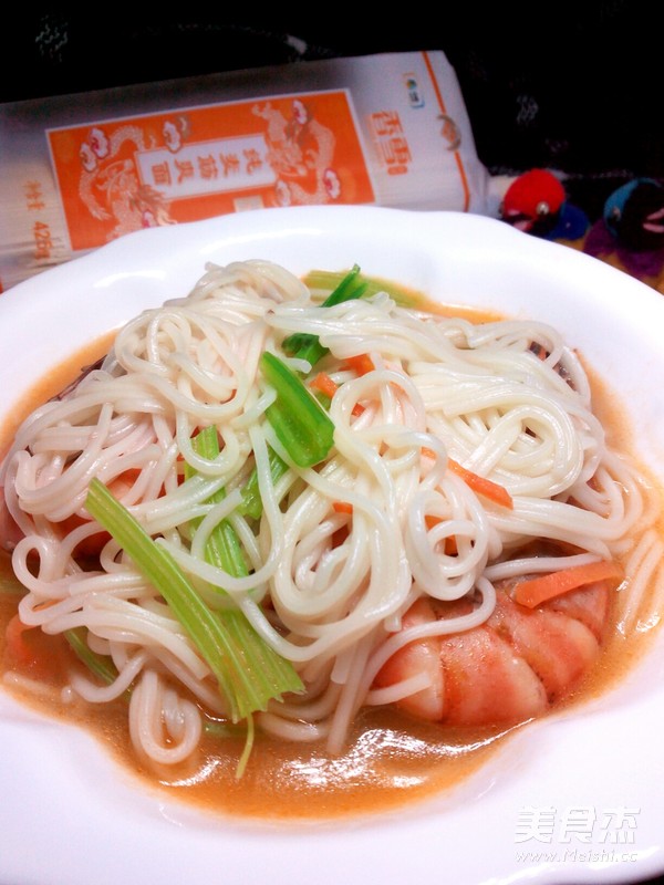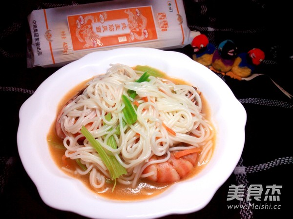 香雪大礼包中的成员中还有两种口味的面条呢,这次我用的是香雪纯麦筋爽面,从外观上看这是一款细面,长度适中,粗细均匀圆润,纯净无杂质,颜色自然无添加剂,从口感上来说筋道爽滑,面香味浓郁,不浑汤,不粘稠,绝对是那种吃过之后就让你忘不了的味道。 主料 挂面150克 竹节虾100克 辅料 芹菜50克 盐1克 胡萝卜20克 调和油10毫升 #香雪面粉#虾汤面的做法 1.准备食材 2.热锅放油,放入竹节虾煎 3.两面均煎至变色 4.放入适量水 5.水开后放入香雪挂面,并用筷子搅拌一下 烹饪技巧 煮面过程中水开后就点一次水,少许水即可,煮至挂面没有白芯为止。