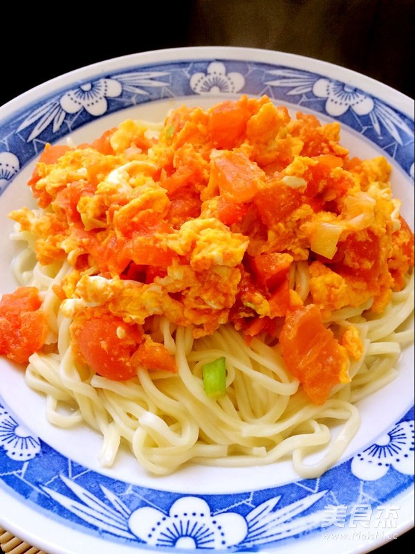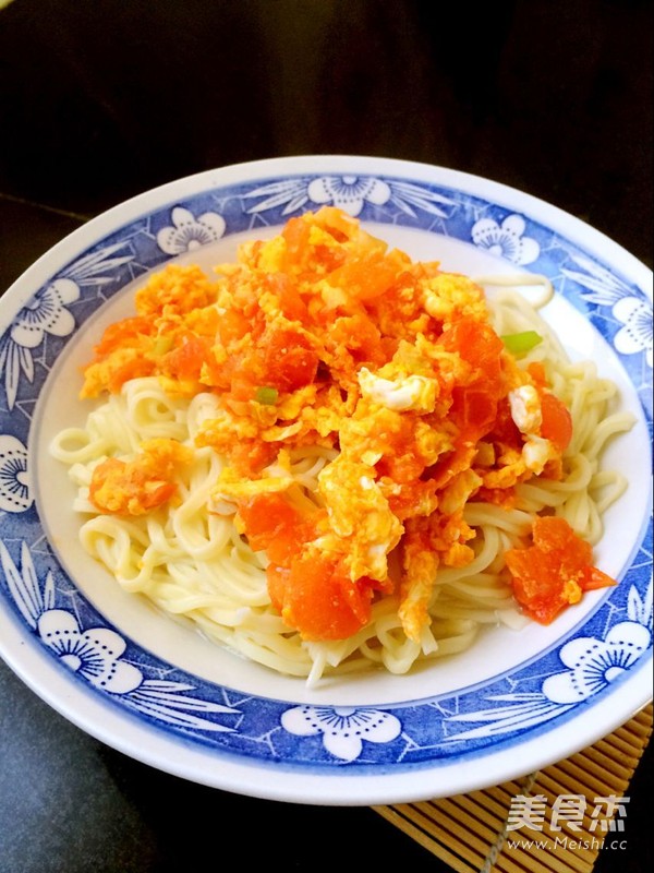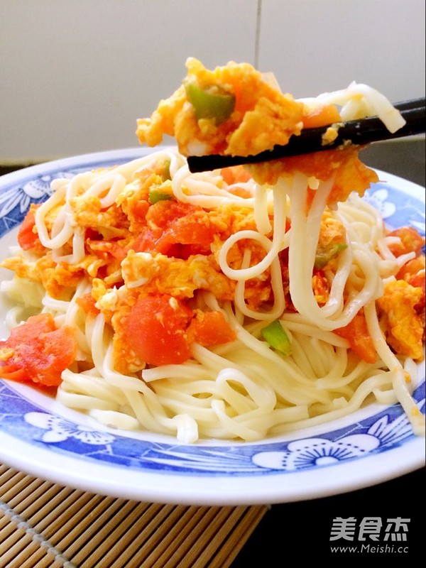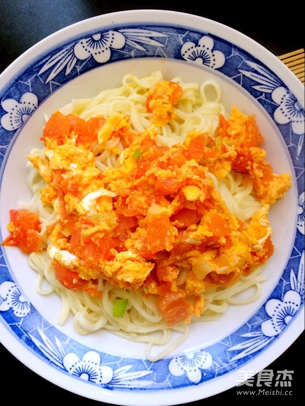 6.加入面条煮熟,煮熟后捞出放入碗中,面条表面淋上西红柿鸡蛋卤即可。
