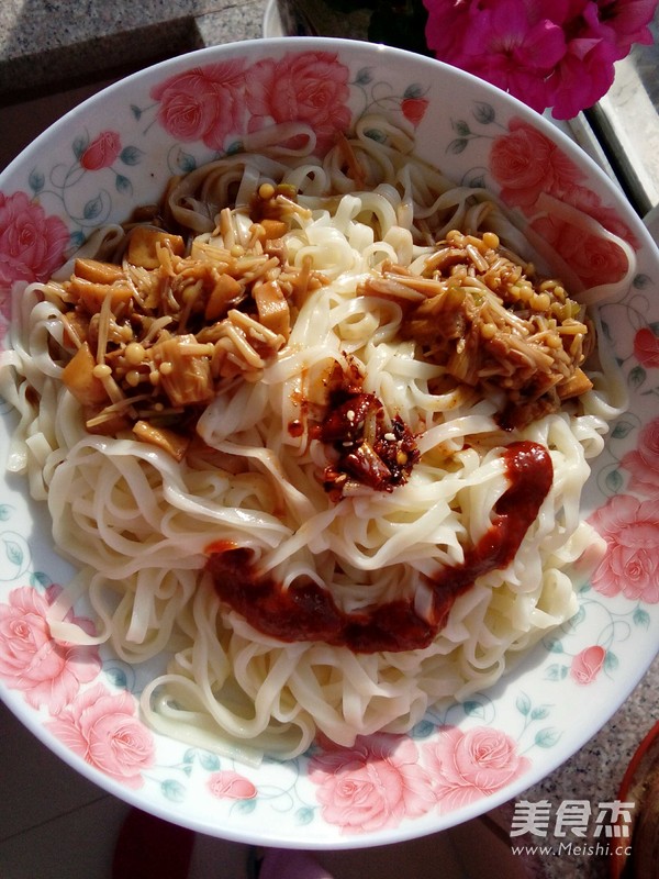 5.煮好的挂面上浇上刚刚打好的金针菇卤,再依个人口味添加少许辣椒油和辣酱即可食用了。