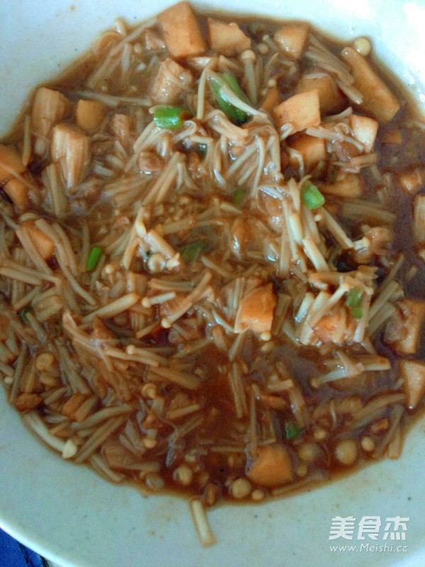4.锅里放油,烧热,下葱花,放入花椒面,酱油,下瘦肉丁,翻炒,然后一起下金针菇段,鱼丸丁,尖椒丁,倒入半杯热水,加盐,醋,熟的豆瓣酱,稍稍翻炒,出锅。